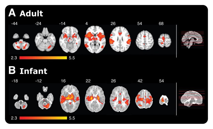 Magnetic Resonance Imaging (MRI) giving a comparison of brain activity in adults and babies when poked with a special retracting rod simulating a sensation of pain. Red-yellow coloured areas represent active brain regions. The side-on view on the far right shows the level at which each scan was taken.A report of the research, entitled 'FMRI reveals neural activity overlap between adults and infant pain', is published in the journal eLife.