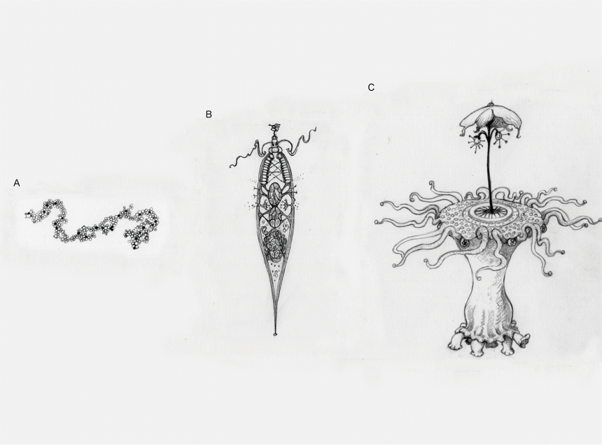 These illustrations represent different levels of adaptive complexity we might imagine when thinking about aliens. (a) A simple replicating molecule, with no apparent design. This may or may not undergo natural selection. (b) An incredibly simple, cell-like entity. Even something this simple has sufficient contrivance of parts that it must undergo natural selection. (c) An alien with many intricate parts working together is likely to have undergone major transitions.