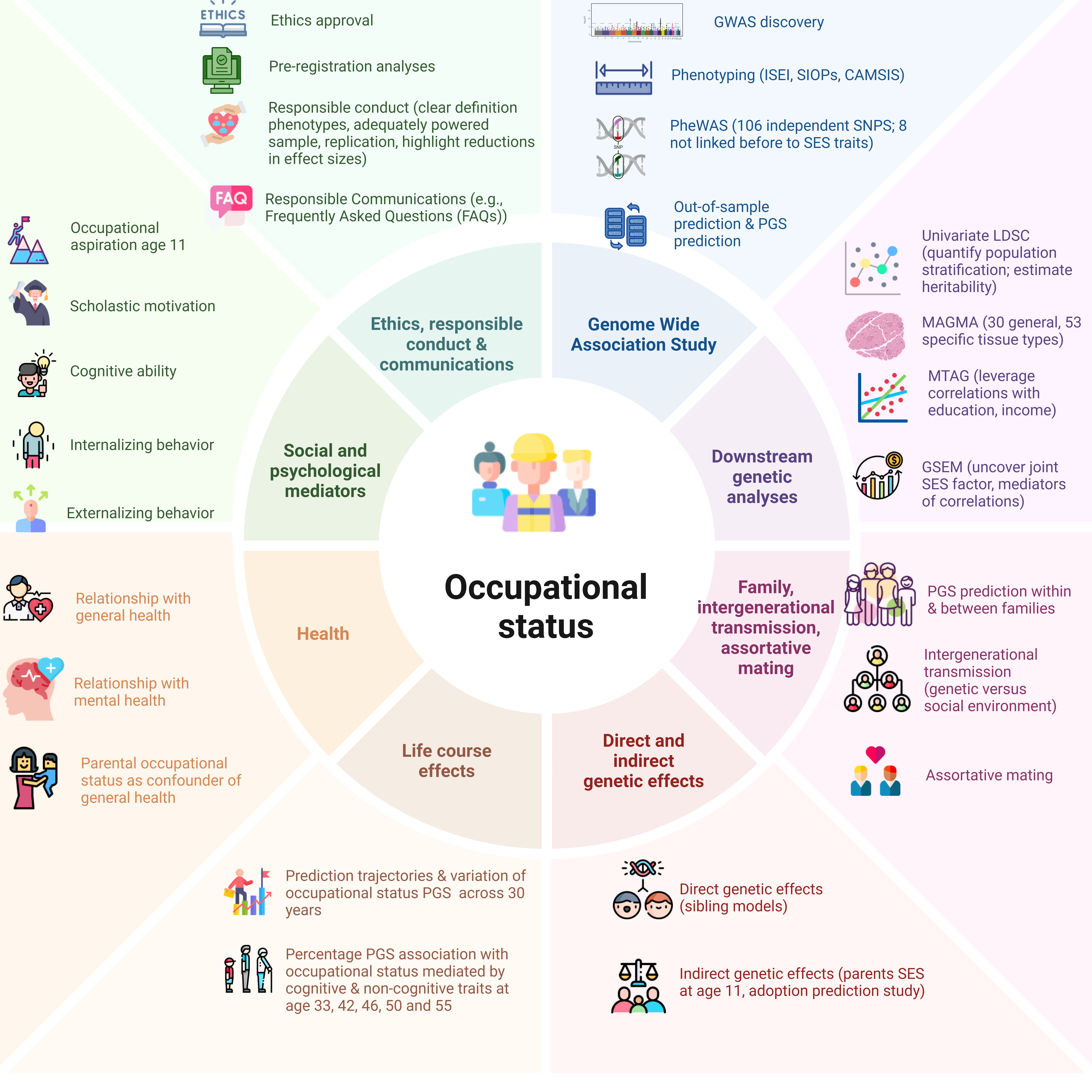 The analyses identified 106 independent genetic variants of occupational status, including eight newly associated with the genetics of socioeconomic status. 5-10% of the variability in occupational status in the population can be explained through the polygenic score produced from the genome-wide association study (GWAS). The study also showed that polygenic score is picking up non-genetic family and environmental information, given that the predictive power of the score drops by over 50% when shared family environment experience of siblings is accounted for. Results showed that this reduction was largely related to socioeconomic differences in assortative mating over generations and indirect (non-genetic) parental effects.