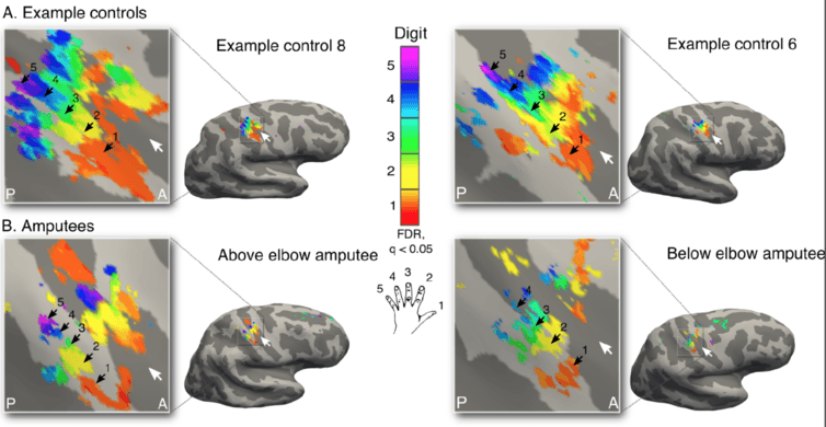 Brain imaging reveals detailed maps of the individual fingers of the hand in amputees (bottom) that are startling similar compared to the hand maps of the two-handed control participants (top).